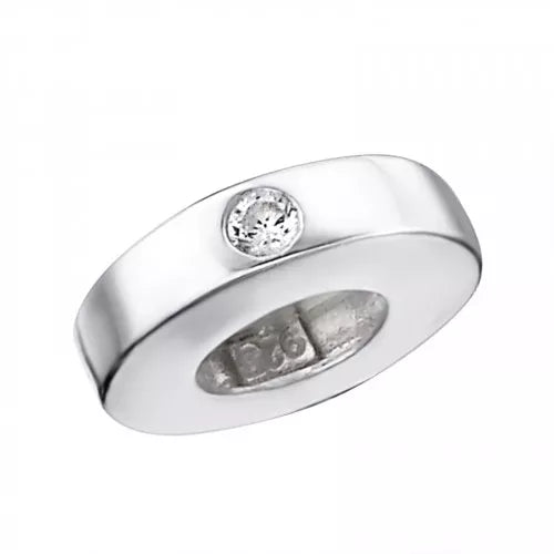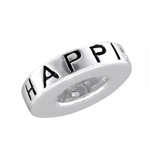 Wat een pareltje is deze subtiele, moderne bead. Helemaal glad, met aan de een kant een glinsterende zirkonia en aan de andere kant de tekst 'happi...