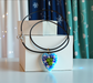• Materiaal: Murano glas hart, met een diameter van 22 mm. Hangend aan een zwart rubberen koord (45 cm.)